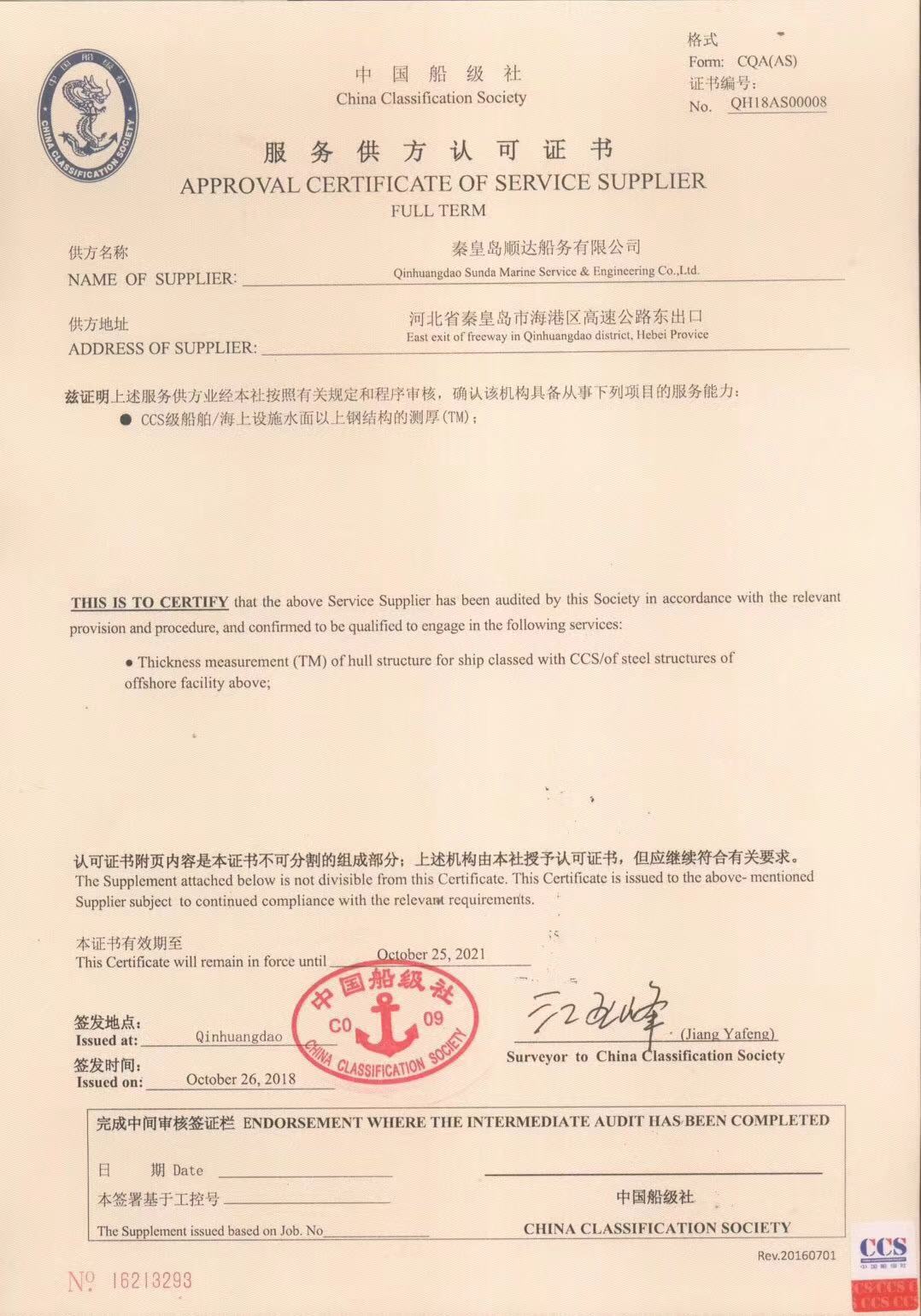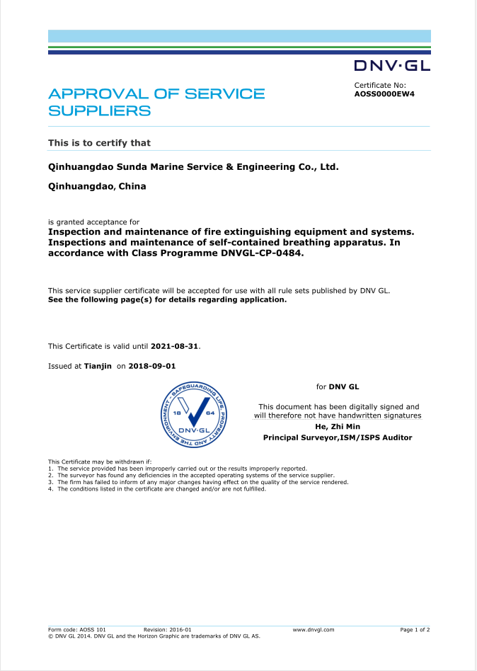 秦皇島順達(dá)船務(wù)有限公司位于美麗的海濱城市、中國(guó)北方著名的能源輸出大港--秦皇島。公司從事于船舶修理、物料供應(yīng)、水下檢測(cè)、船體測(cè)厚、消防救生設(shè)備及救生艇檢驗(yàn)、電氣自動(dòng)化修理等服務(wù)。 公司自1997年成立至今,先后為國(guó)內(nèi)外船東修理、檢驗(yàn)各類船舶萬(wàn)余艘,積累了豐富的施工經(jīng)驗(yàn)。公司現(xiàn)有場(chǎng)地100余畝,員工30余人,以及工程用車若干臺(tái)。我們公司一直本著嚴(yán)以律己、真誠(chéng)待人、精益求精、信譽(yù)至上的經(jīng)營(yíng)理念,以優(yōu)質(zhì)的服務(wù)、專業(yè)的施工、合理的收費(fèi),得到了國(guó)內(nèi)外船東的廣泛認(rèn)可,贏得了良好的口碑和信譽(yù)。 公司已取得了中國(guó)船級(jí)社(CCS)、美國(guó)船級(jí)社(ABS)、日本船級(jí)社(NK)、德國(guó)船級(jí)社(DNV GL)等各個(gè)船級(jí)社的消防救生和救生艇檢驗(yàn)資質(zhì), ...